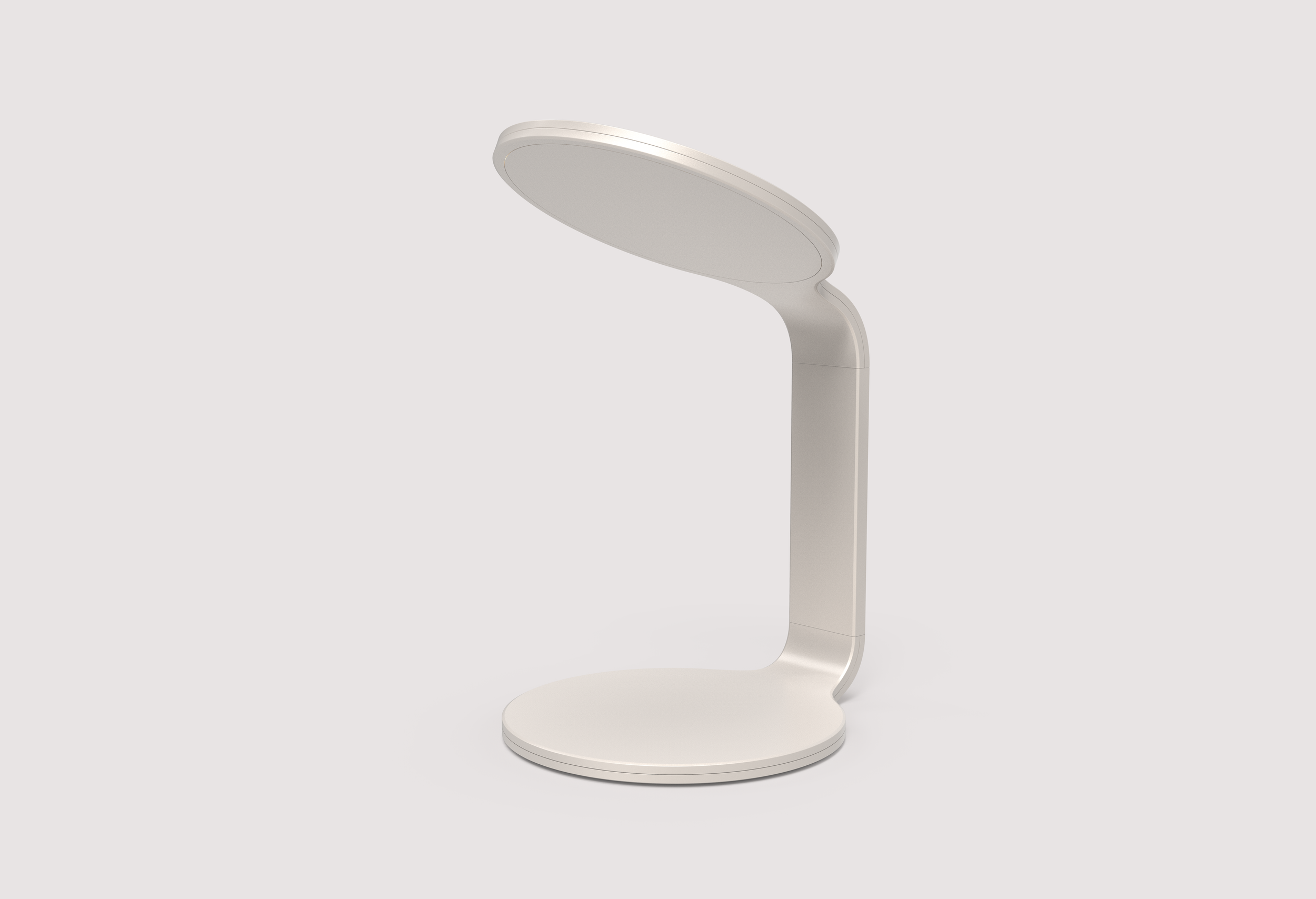 Modern white desk lamp with a curved design and an oval-shaped base.